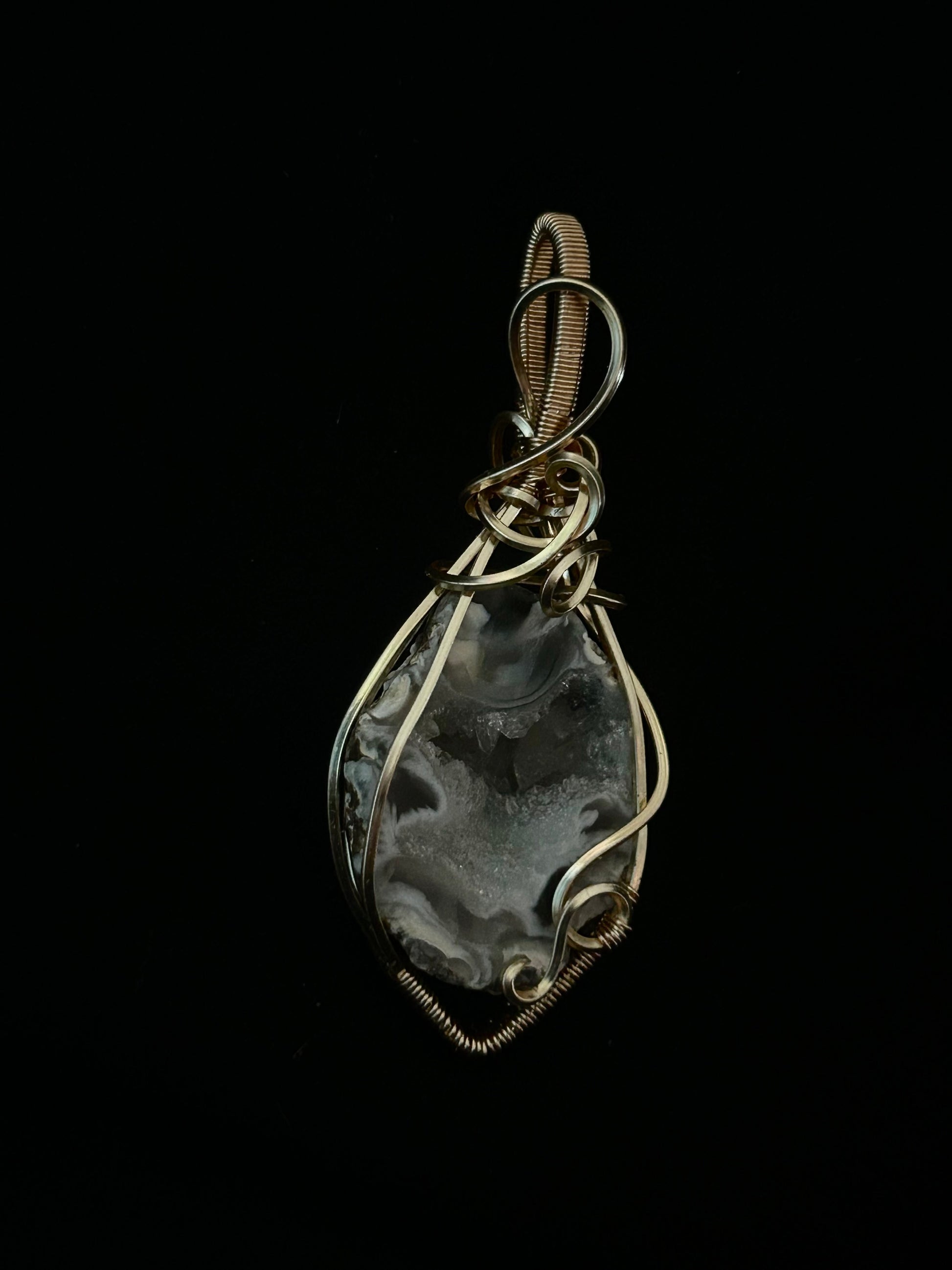 A druzy agate wire wrapped pendant handmade by me, crafted with color-preserving coated silver wires. Comes with a black polyester adjusted cord for immediate wear.