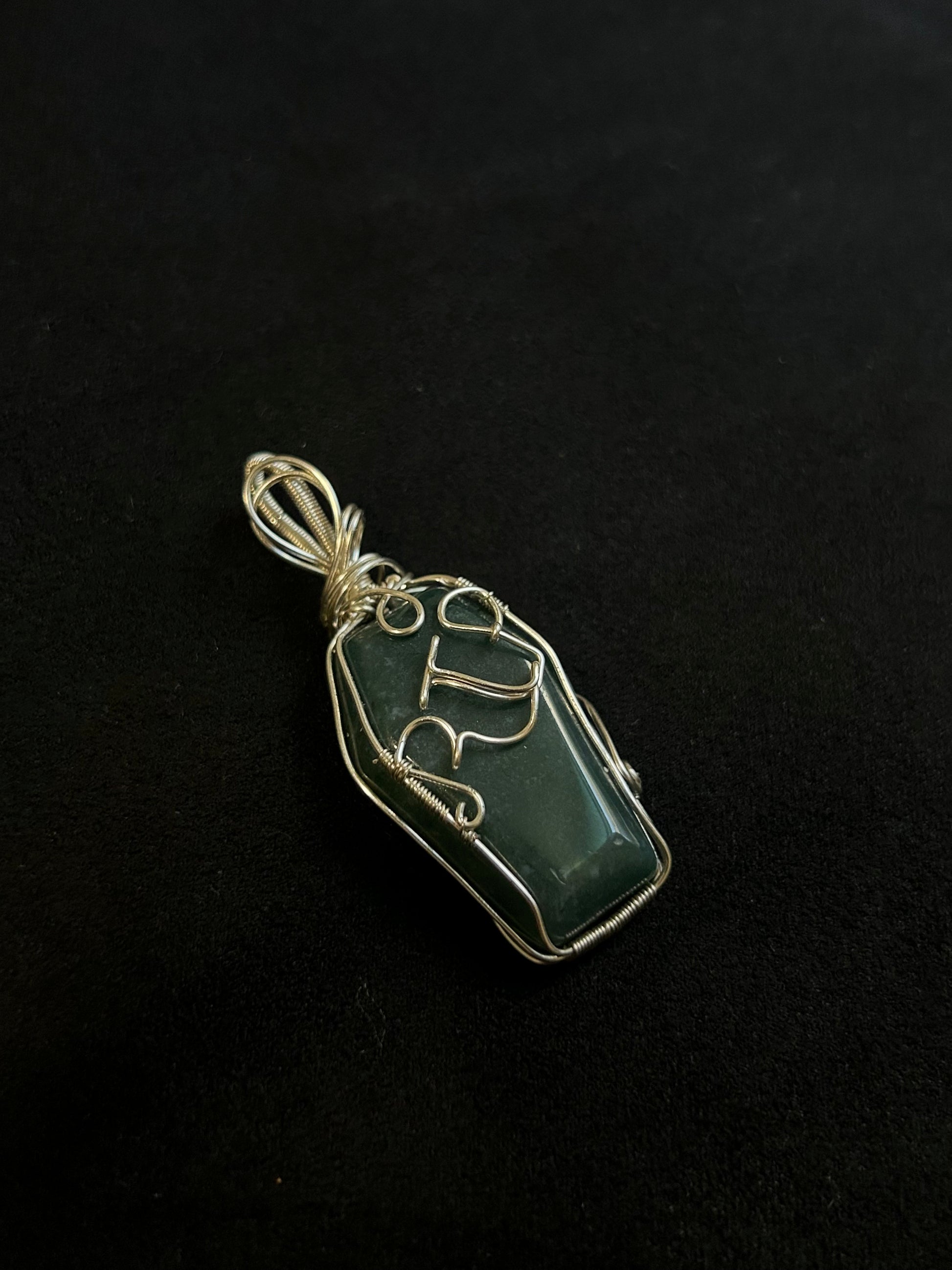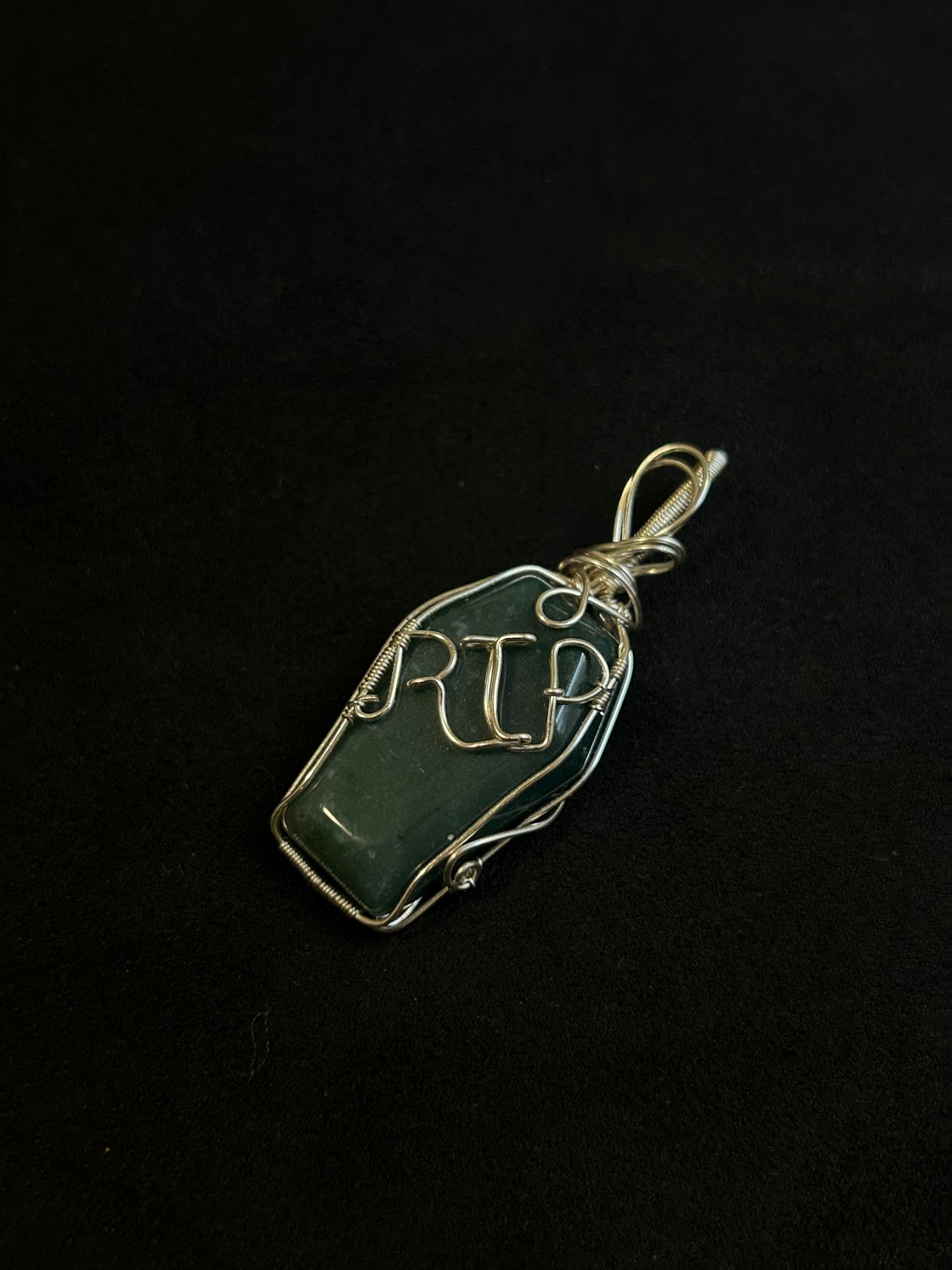 A sgreen aventurine coffin with text "RIP" on the front, wire wrapped pendant handmade by me, crafted with color-preserving coated silver wires. Comes with a black polyester adjusted cord for immediate wear.